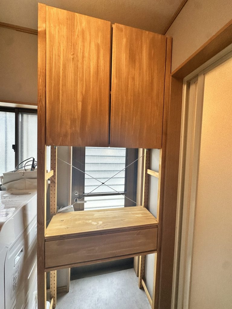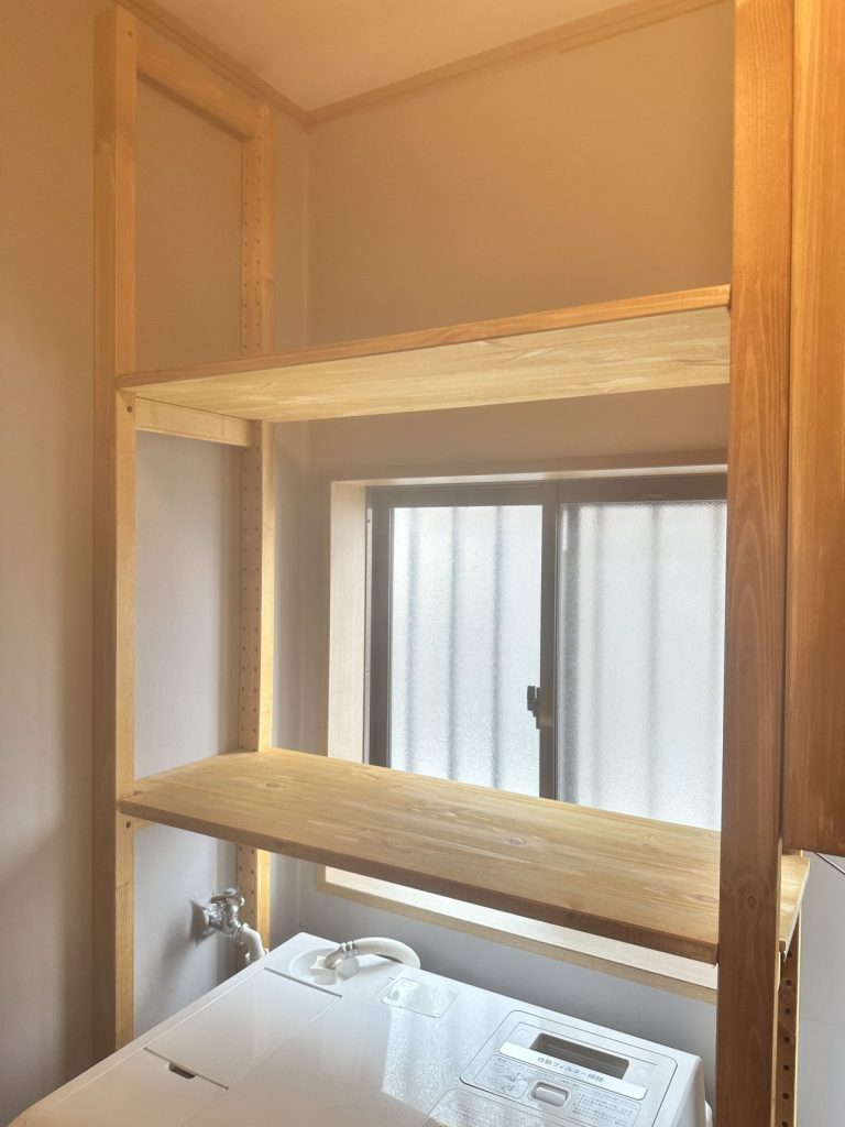 左半分は、洗濯機の上部の空間を利用して、見せる収納棚を取付